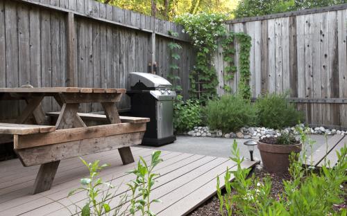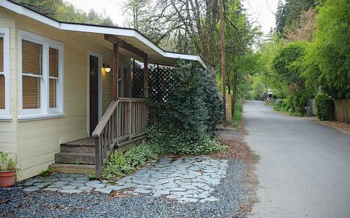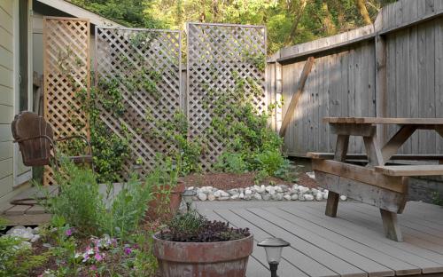 The front porch includes a semi-private enclosed sitting area. The backyard is landscaped with flower beds and an herb garden, picnic table, BBQ, outdoor shower and sitting area for enjoying the evening in this river neighborhood.